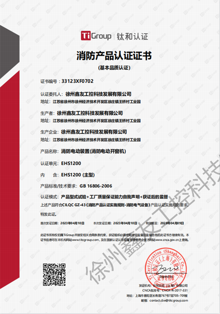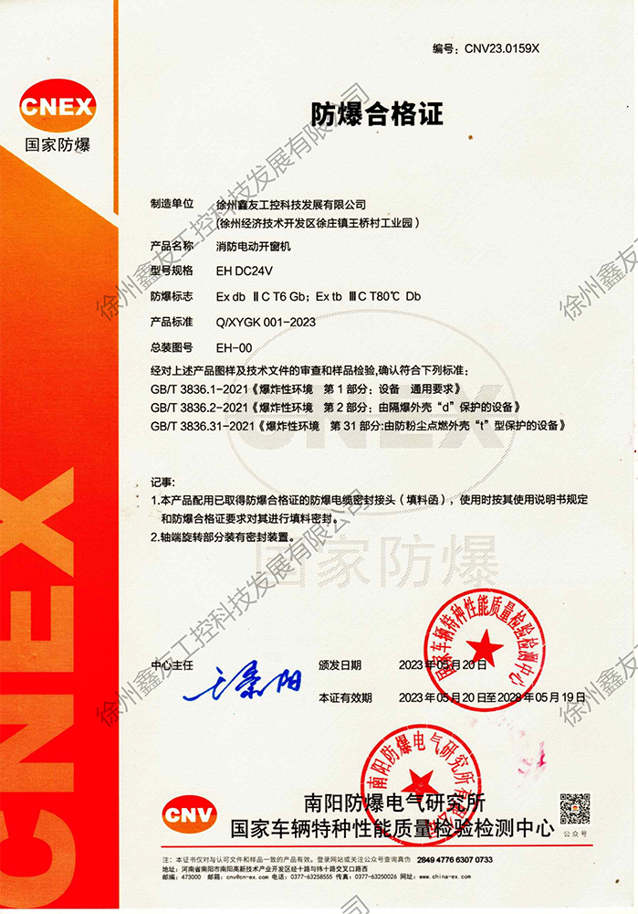 徐州鑫友工控科技發(fā)展有限公司成立于2008年,占地31600平方米,全資子公司:江蘇良紫工程科技有限公司,旗下 有“鑫友”及“MASTER.W主人窗控”兩個品牌系列,公司全面貫徹執(zhí)行IS09001:2015質量管理體系標準,產(chǎn)品順利通過歐盟CE認證和中國***消防電子產(chǎn)品認證,通過可燃性粉塵環(huán)境下、爆炸性環(huán)境下防爆合格產(chǎn)品檢驗。排煙天窗整窗通過***消防產(chǎn)品質量監(jiān)督檢驗中心檢測。先后獲得多項******及榮譽證書。集研發(fā)、加工、生產(chǎn)、制造、銷售、安裝及售后于一體,是一家高起點、研發(fā)能力強的專業(yè)智能化***技術企業(yè)。